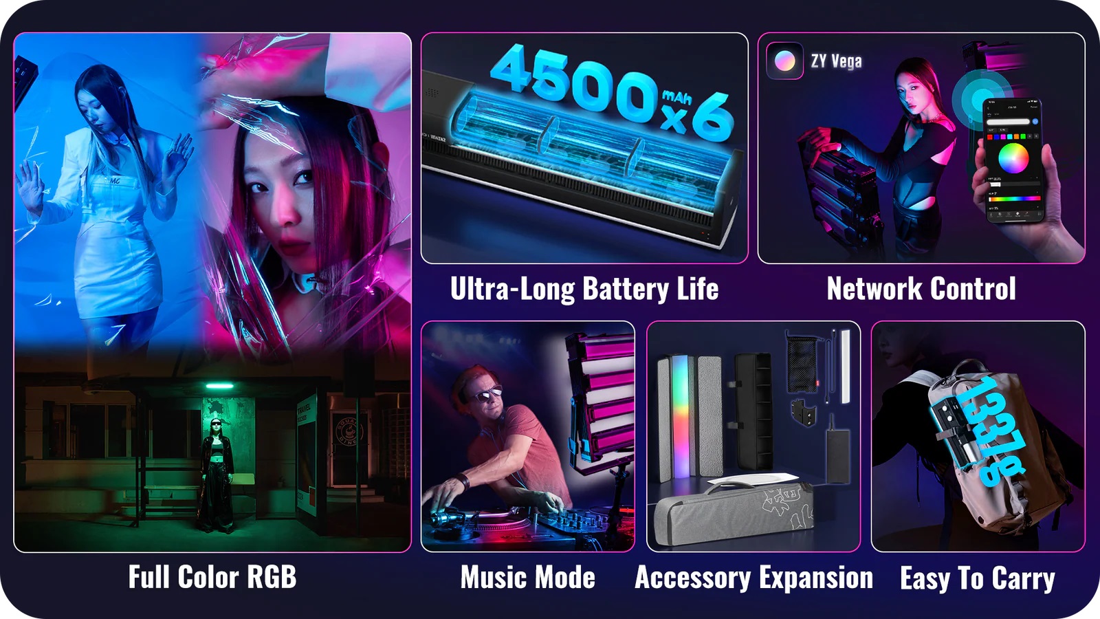 • Kontrola: Podržava ZY Vega aplikaciju putem Bluetooth Mesh mreže, što omogućava daljinsko podešavanje, usklađivanje boja sa slikama kamere i grupnu kontrolu